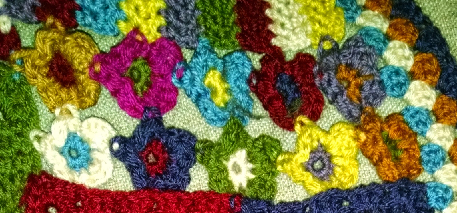 Panel 3: Multi Colored Flowers, Daisy Granny Squares, Granny Cluster Stripes, Circle Center Granny Square, Multi Colored Flowers, Vertical Lines, Star Patches, Puff Stitch Flowers, Granny Cluster Stripes, Star Patches, Multi Colored Flowers